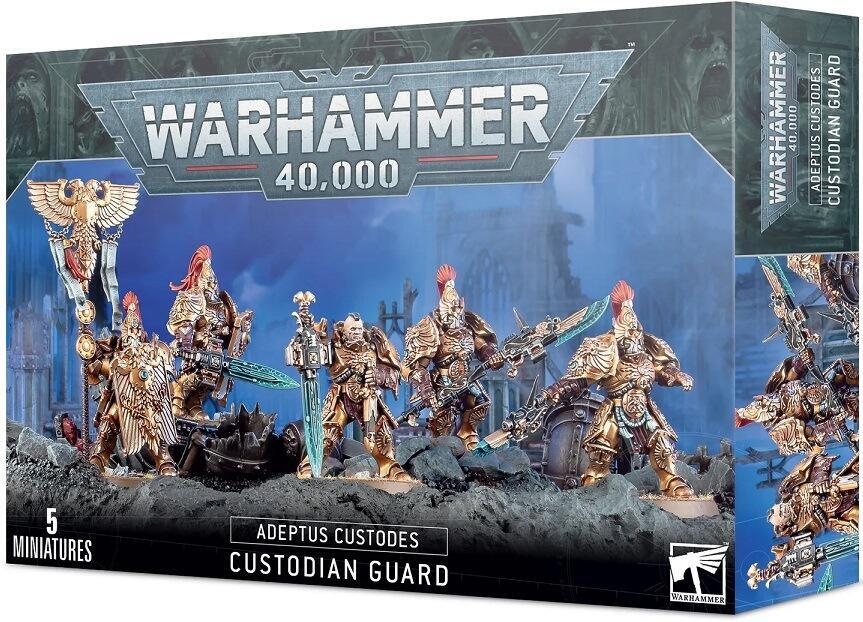 Dette plastsæt i flere dele indeholder de nødvendige komponenter til at samle et sæt på 5 Adeptus Custodes Custodian Guard, bevæbnet med enten guardian spears eller sentinelblade og stormskjolde. 1 model kan samles som Shield-Captain med kappe og valg af 2 hoveder, og 1 model kan samles som Vexilus Praetors med Custodes Vexilla.