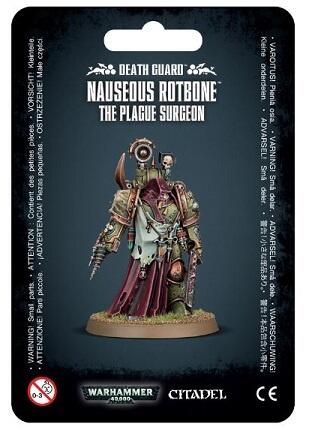 Dette flerdelte plastik-sæt indeholder de nødvendige komponenter til at samle Nauseous Rotbone, en Death Guard Plague Surgeon. Han bærer en bolt pistol og et balesword, men det sjove ligger i de forskellige korrumperede medicinske instrumenter, han bærer – narthecium-lignende instrumenter, der indeholder forfærdelige plager, er overalt på hans rustning, med en gammel, rusten reduktor, der er perfekt til at stjæle gene-seeds, på hans højre arm. Det meste af hans rustning er skjult af en hætte og kappe, men den rustning, der er synlig, er dækket af huller, rust og korrosion, som man kan forvente af en sådan tilhænger af Death Guard. Hans højre skulder bærer et modbydeligt plaguebearer's head, og anordningen på hans ryg... jo mindre der siges om den, desto bedre.