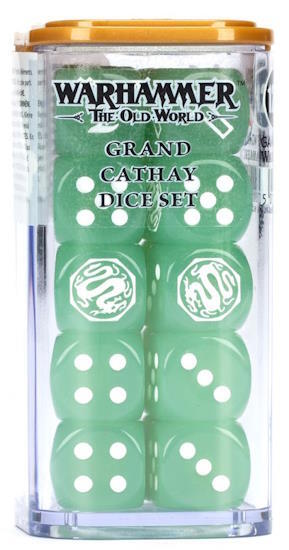 Dette er et Dice Set af 20 sekssidede terninger med afrundede kanter til brug i Warhammer: The Old World-spil, der har Armies of Grand Cathay som tema. De er støbt i jadegrøn akrylplast med hvide blækprikker og -designs og måler 16 mm langs hver kant. På standard-D6'erne er 1-5-siderne traditionelt udsmykket, og hver 6'er er dekoreret med det drakoniske ikon for Grand Cathay.