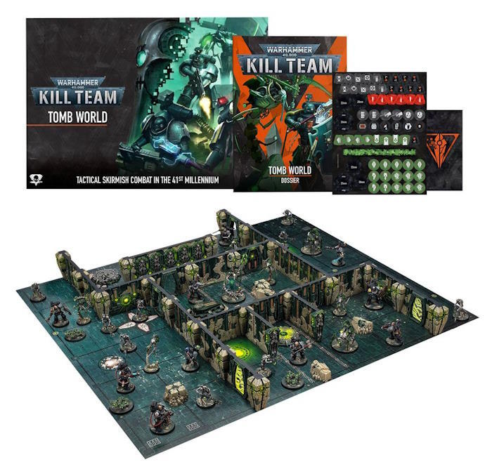 Kill Team: Tomb World sætter to elitehold af agenter op mod hinanden i en gammel, forfalden Necron-krypt. I æsken finder du to hold af elite xenos-jagende Deathwatch Space Marines – specialister ansat af The Inquisition til at jage fremmede trusler. En bizar, insektlignende Cryptek er også inkluderet, sammen med hendes hær af konstruktioner, der er vendt sig mod deres oprindelige formål om at vedligeholde Necronernes slumbering apparatus. Du finder en killzone med Necron-terræn, de regler, du skal bruge for at spille spil i dens klaustrofobiske korridorer, og et sæt tokens og kort, der hjælper dig med at holde styr på det hele.