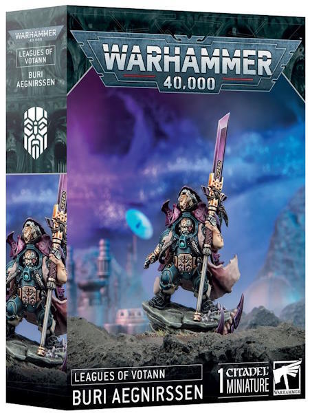 Dette flerdelte plastik-sæt indeholder Buri Aegnirssen, en voldsom leder til dine Leagues of Votann-hære i Warhammer 40.000-spil. Denne vilde soldat har været i utallige kampe og udholdt skader, der ville have lagt de fleste Kin ned. Han svinger en custom darkstar glaive og en Autoch-pattern bolt pistol sidearm med ekspertise. Buri er den ideelle kommandør for en aggressiv styrke, da han gerne tager kampen op med sine fjender, uanset hvem eller hvad de er.