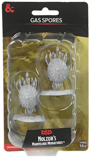 Nolzur's Marvelous Miniatures - Gas Spores er en pakke med 2 plastikfigurer fra Dungeons & Dragons-verdenen. Gas Spores er sfæriske, svævende svampevæsner, med ét centralt falsk øje og ti paddehatte på toppen. Disse detaljer gør at de ofte ligner de farlige, enøjede Beholders, indtil man kommer tættere på dem. Som svampe har de ingen tankegang og svæver bare tilfældigt rundt som groteske balloner - Men ufarlige er de ikke! De spreder sporer der forplanter sig i kroppen øjeblikkeligt i kontakt med huden, hvilket dræber værten indenfor en dag, og det tager kun en håndfuld dage før liget har produceret adskillige nye Gas Spores. Akkurat som balloner er de også opsvulmede og under højt tryk, hvilket gør dem svære at komme af med - Bare et let stød vil få dem til at eksplodere og sprede deres smitsomme sporer vidt omkring.