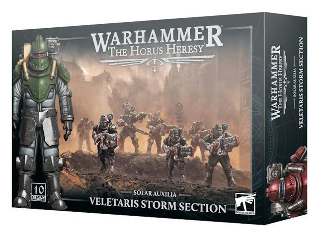 Dette flerdelte plastik-sæt indeholder en Veletaris Storm Section bestående af 10x Veletarii, elite Solar Auxilia-stormtropper iklædt forstærket void-armour. Disse soldater kan hver især udstyres med ødelæggende volkite chargers til at brænde mål med termiske stråler eller tohånds storm axes, der kan skære igennem selv de hårdeste fjender. Du kan mikse og matche arm- og kropsstillinger til begge våbentyper, hvilket giver masser af visuel variation, efterhånden som din cohort udvides.