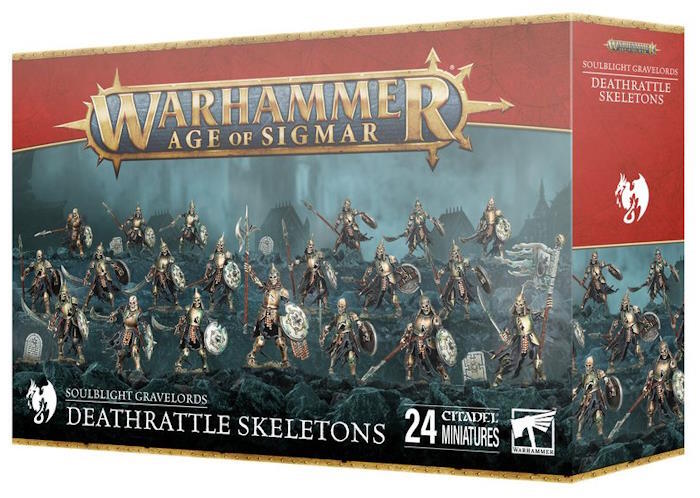 De kan samles som én stor enhed eller to enheder med 10 krigere, hver med deres egen valgfri champion og standard bearer. Champions kan vælge mellem fire forskellige våben, mens de andre Deathrattle Skeletons kan bevæbnes med enten spyd eller takkede sværd. Våbnene og skjoldene kan udskiftes på tværs af figurerne, hvilket gør det nemt at tilpasse dine dødsløse legioner. Sættet indeholder også fire gravsten-tokens.