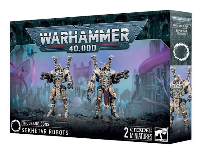 Dette flerdelte plastik-sæt indeholder to Sekhetar Robots, kraftfulde kampautomater til dine Thousand Sons-hære i Warhammer 40.000-spil. Disse truende mekaniske konstruktioner er udstyret med heavy warpflamers og hellfyre missile racks. De er også begge bevæbnet med en pyreflux meltagun, som valgfrit kan erstattes med en warpflame projector og en power claw. De er ideelle til at bevogte vigtige mål og holder let fjendens krigere på afstand med deres dødbringende våben.