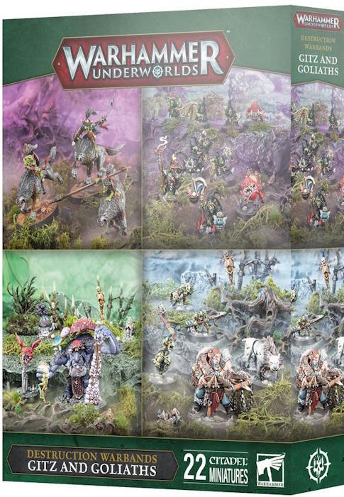 Dette sæt indeholder fire ødelæggelses-tema-krigsbanditter til Warhammer Underworlds. Alle miniaturerne er push-fit, støbt i farvet plast og inkluderer sceniske baser på rammerne, så du hurtigt kan komme i gang med at spille. Du finder også warscroll-kort og fighter-kort til hver krigsflok. Hrothgorns Mantrappers er en versatil Flex-krigsflok, Rippas Snarlfangs er en aggressiv Strike-krigsflok, Zarbags Gitz er en ambitiøs Take and Hold-krigsflok, og Mollogs Mob har Mastery-spillestilen, som belønner spillere for omhyggelig styring.
